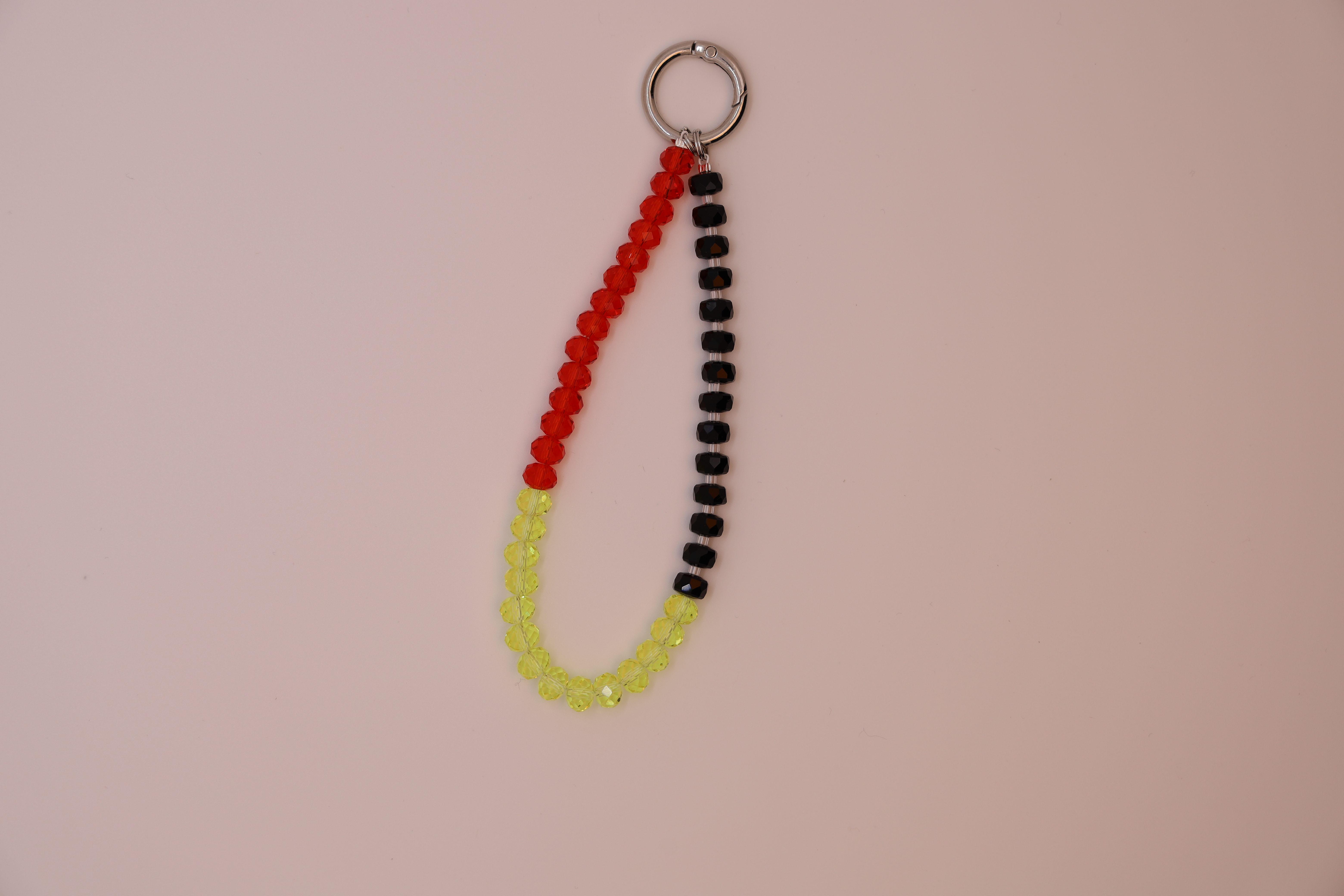 14顆7mm紅色, 14顆7mm黃色以及14顆7mm黑色水晶珠配搭而成的手機鍊